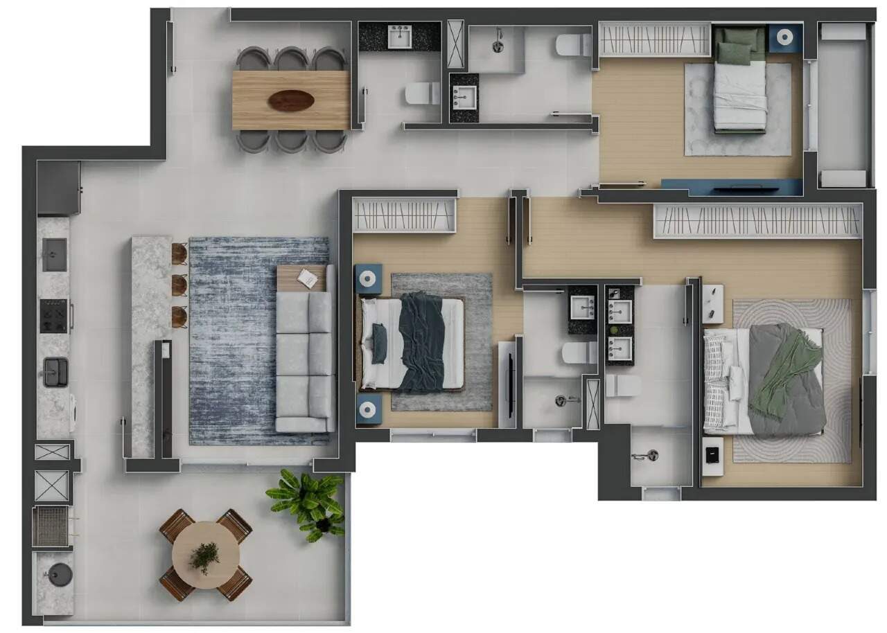 O apartamento de 118m² do Fazenda Garden apresenta uma distribuição inteligente, com living espaçoso integrado à sacada, criando um ambiente social fluido e favorecido pela entrada de luz natural. A área íntima conta com três suítes bem dimensionadas, garantindo conforto e privacidade. A cozinha em conceito moderno dialoga com o living, permitindo aproveitar todo o potencial da planta com uma decoração funcional e acolhedora.