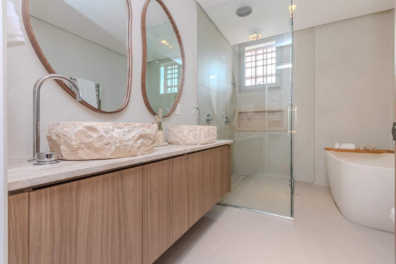 A área íntima é composta por quatro suítes elegantes, com móveis planejados e acabamentos de alto padrão. A suíte master oferece amplitude, conforto e vista inspiradora. A cozinha é funcional e moderna, conectada à área de serviço independente.