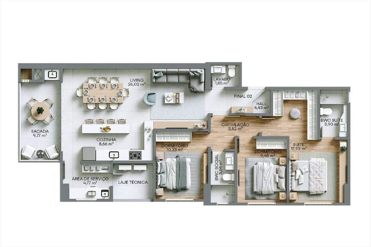 O apartamento do Residencial Monte Viso destaca-se pelo living integrado à cozinha e pela sacada gourmet, criando uma área social fluida e convidativa. A planta favorece uma excelente circulação, permitindo múltiplas configurações de decoração. As suítes oferecem metragem ampla, enquanto o outro dormitório complementaa o imóvel com versatilidade para quem busca um apartamento na Fazenda para morar com conforto ou investir.