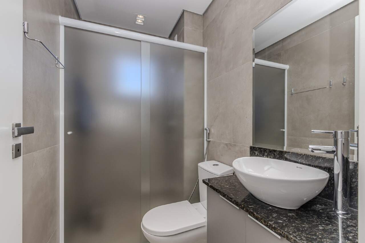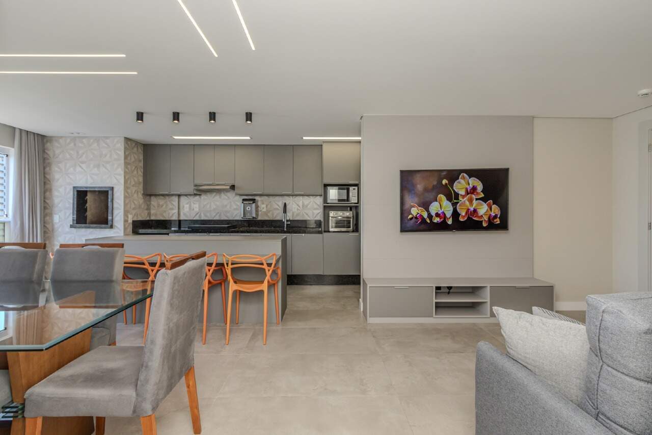 Este apartamento oferece ambientes sociais integrados e bem iluminados. A sala de estar e jantar se conectam à cozinha ideal para momentos de lazer. A cozinha americana com churrasqueira a carvão é funcional e prática, com acesso direto à área de serviço.