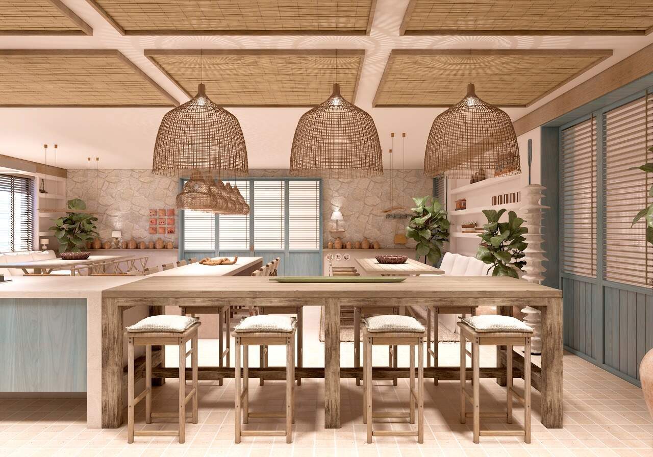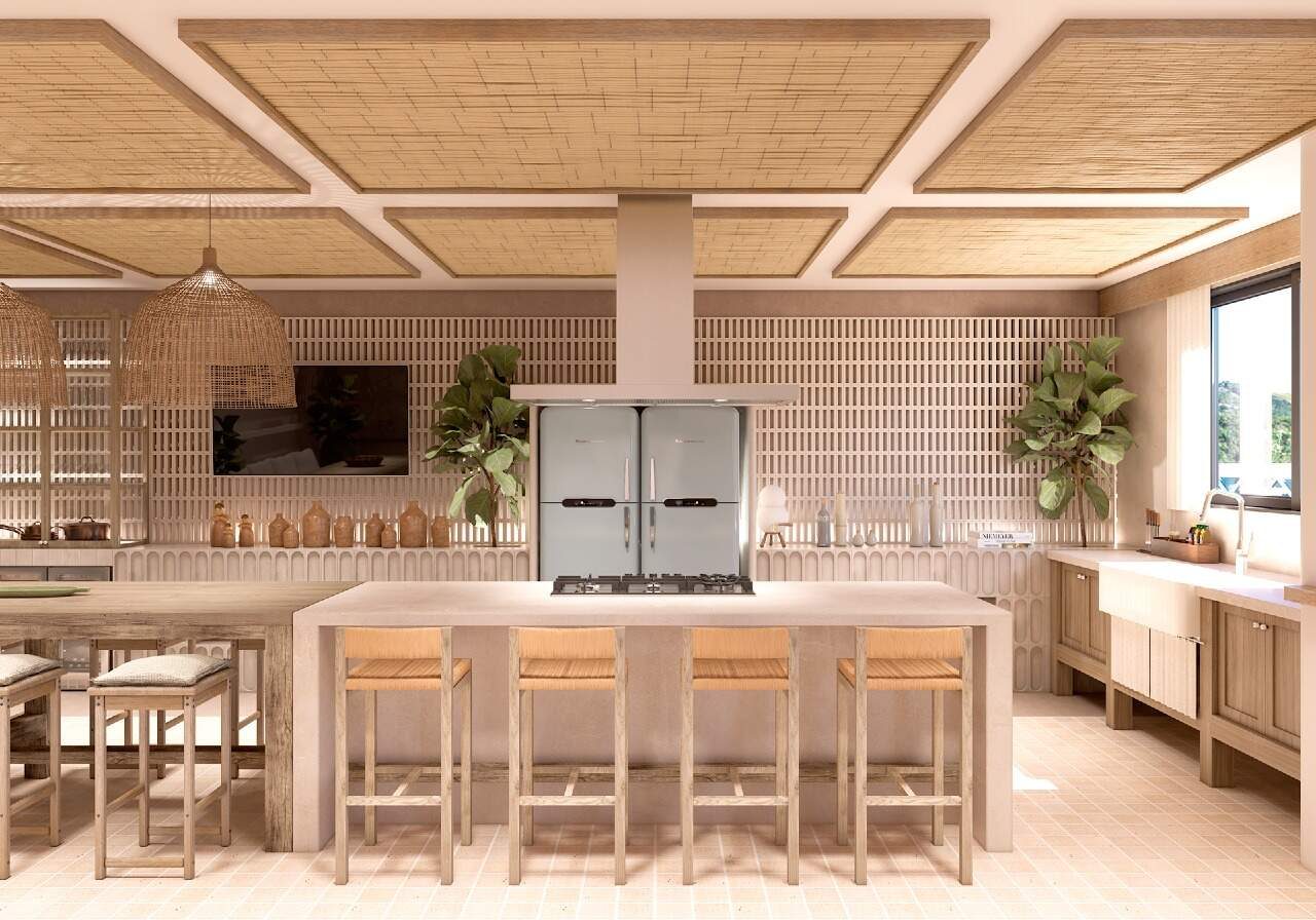 Já o pavimento superior é dedicado à área social, com um living integrado entre sala de estar, jantar e cozinha gourmet, criando um ambiente perfeito para receber amigos e familiares. A área externa conta com terraço e espaço para lazer, além de churrasqueira a carvão e ambientes ideais para contemplar a vista da região.